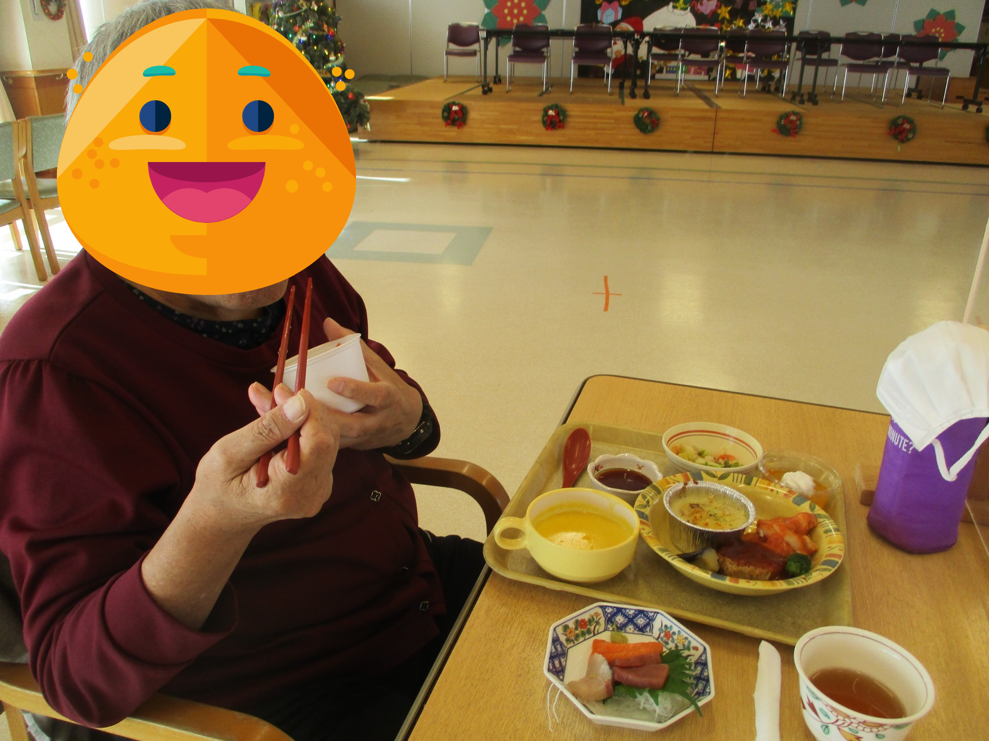今年もデイサービスホールにてクリスマス会が行われました。この日のメニューはピラフやグラタン、エビのサラダ、カボチャのスープ、お刺身など豪華なランチメニューでした。