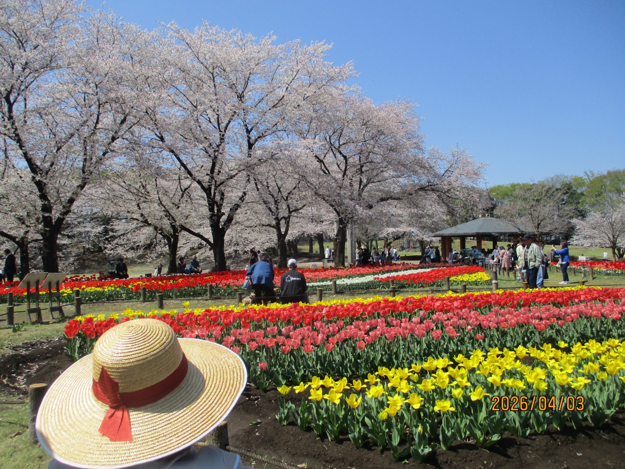 深谷グリーンパークには桜とチューリップがたくさん咲いていますよ。27日(金)は桜は8分咲き、チューリップは全体の半分くらい咲いていました。