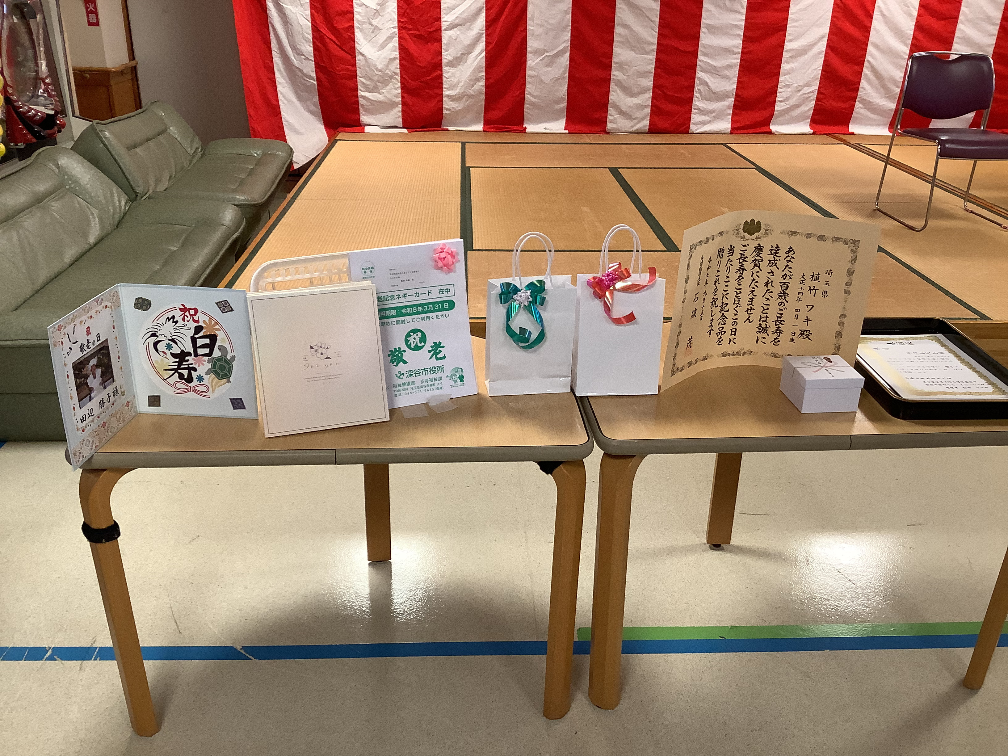 ふじさわ苑では、皆さん敬老のお祝いですが、百寿、白寿、米寿の方は、施設長から、表彰状の贈呈がありました。また、深谷市からの記念品の贈呈も行いました。