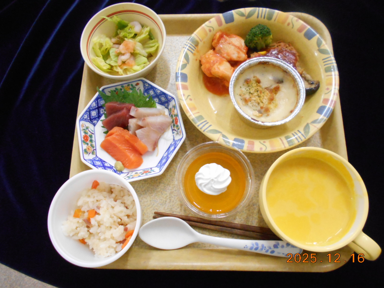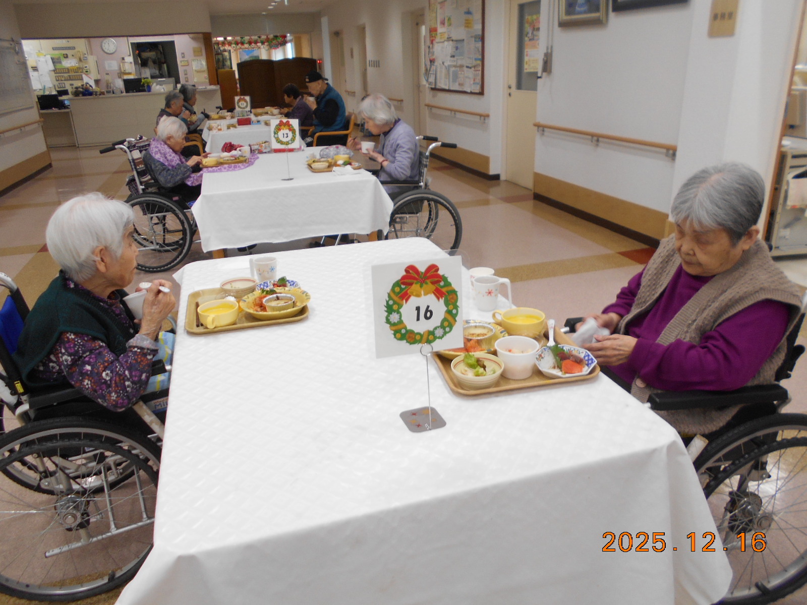 クリスマスランチは、テーブルセッテイングを行い、クリスマスソングをBGMにおいしくいただきました。